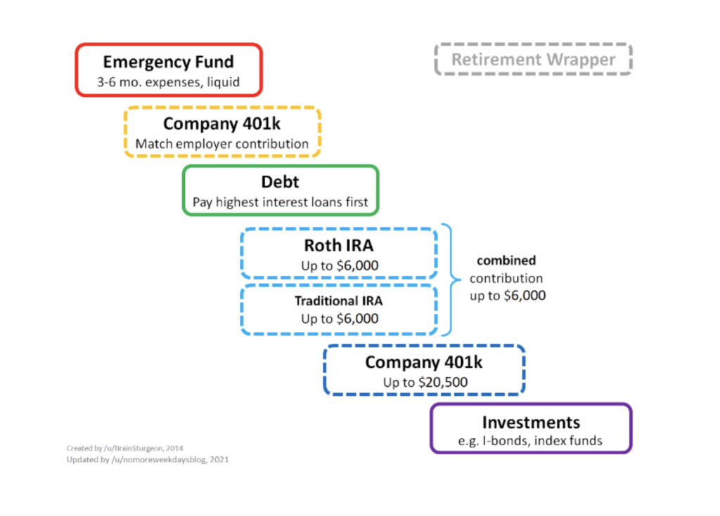 - Once you have an emergency fund and met your employer’s 401k/403b match (if applicable), then focus on paying down debt. You can also budget saving for upcoming purchases or tuition here.